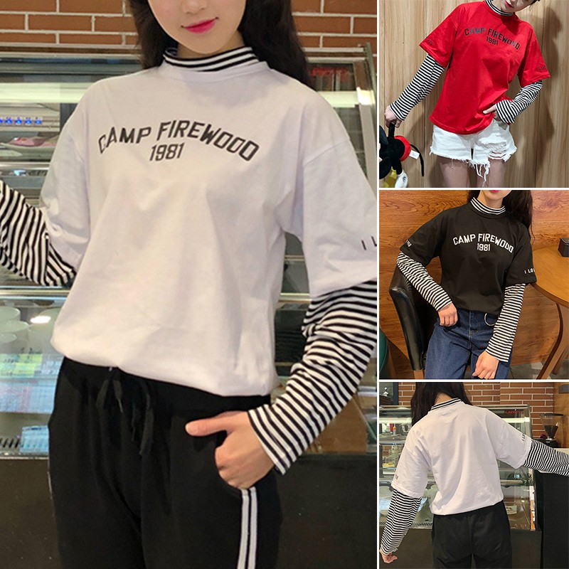 Korean 2020 Korean Version Of The Striped Women Clothes Sleeve Fake Two Piece Blouse Student Cartoon Printed Long Sleeved Loose T Shirt Baju Murah Shopee Malaysia
