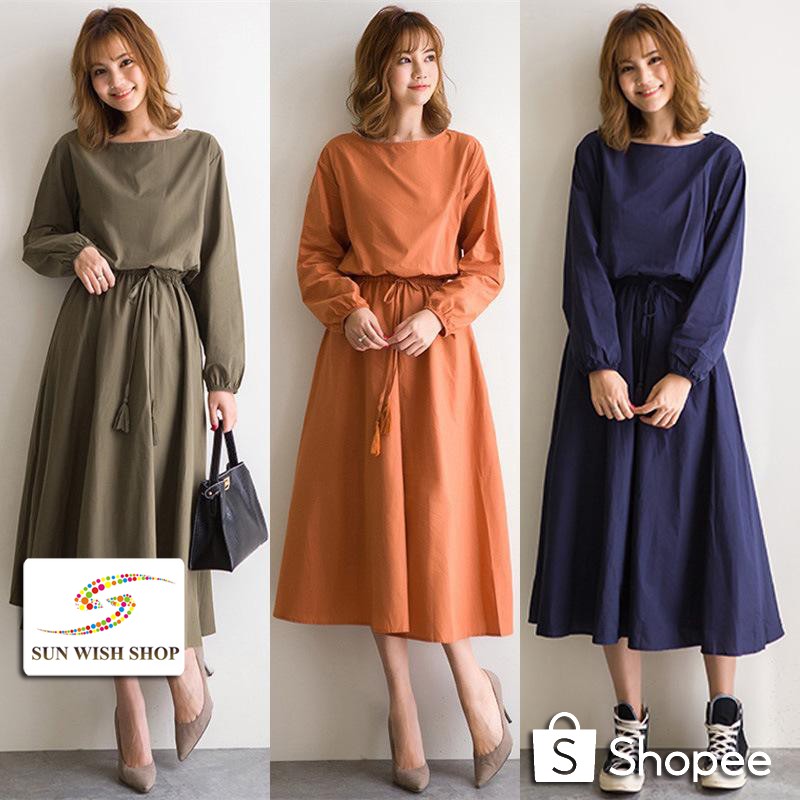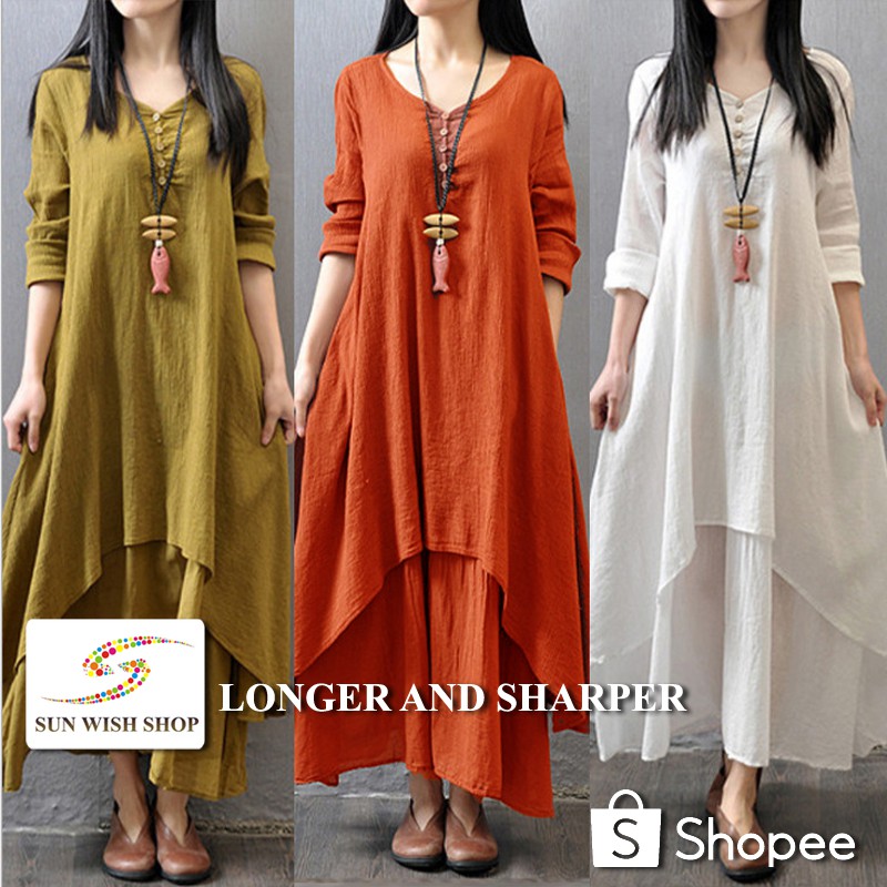 Sunwish Sws10161 Casual Korean Cotton Linen Dress Baju Dress Wanita Labuh Dress Muslimah With Waist Belt Shopee Malaysia