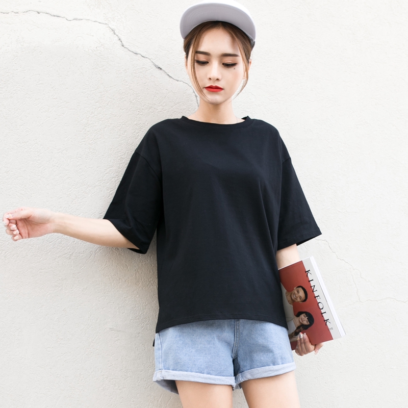 Kaos T Shirt Wanita Dengan Model Potongan Longgar Lengan Pendek Dan Warna Hitam Polos Bergaya Korea Shopee Indonesia