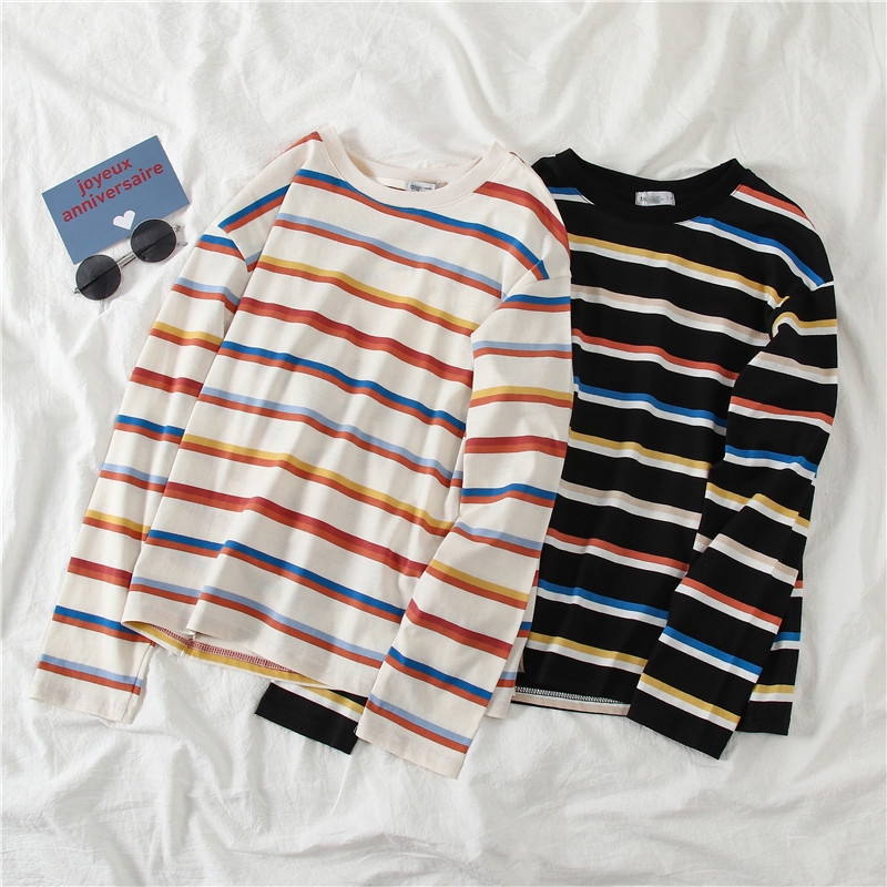 Korean 2020 Korean Version Of The Striped Women Clothes Sleeve Fake Two Piece Blouse Student Cartoon Printed Long Sleeved Loose T Shirt Baju Murah Shopee Malaysia