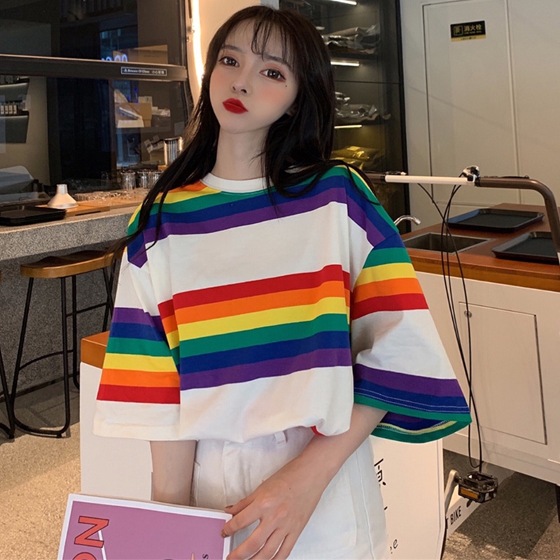 Rainbow Stripe Kaos Longgar Lengan Panjang Kaos Wanita Dicetak Korea Kaos Shopee Indonesia