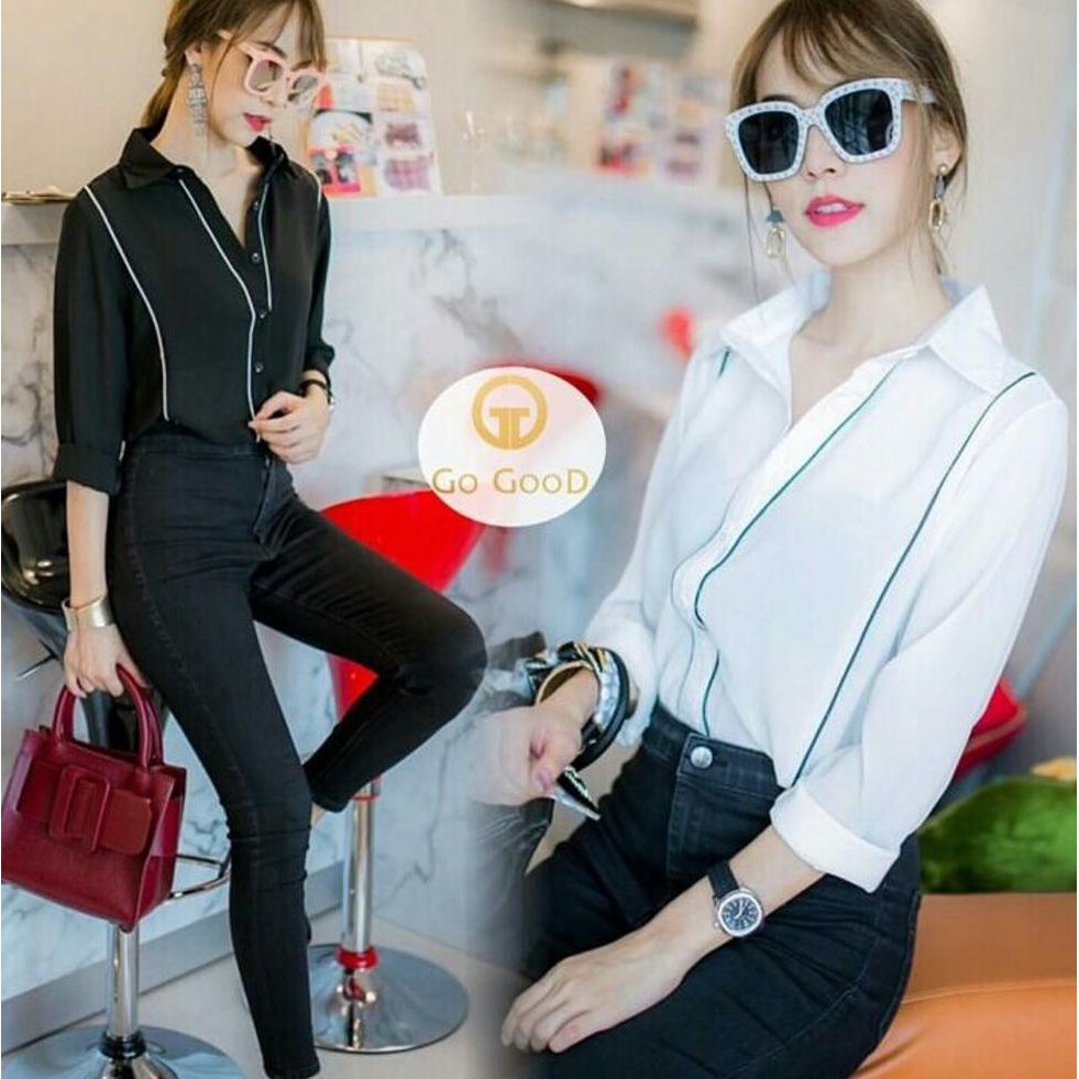 C8 Sfs Kem List Kemeja Hitam Putih Wanita Trendy Murah Modis Simple Polos Elegan Modern Kerja Kantor Shopee Indonesia