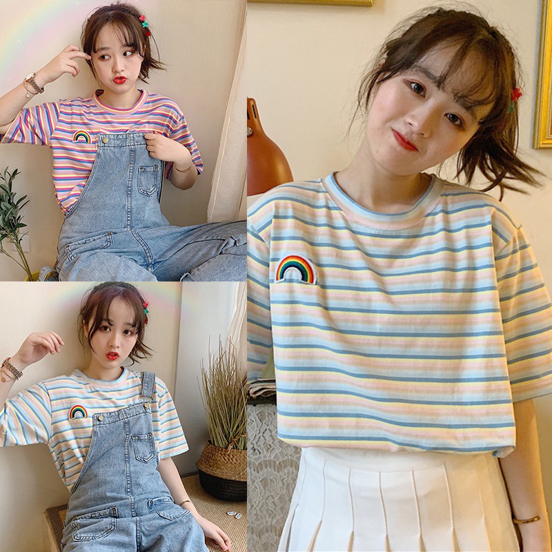 Kaos T Shirt Wanita Lengan Pendek Dengan Potongan Longgar Dan Motif Garis Garis Warna Pelangi Shopee Indonesia