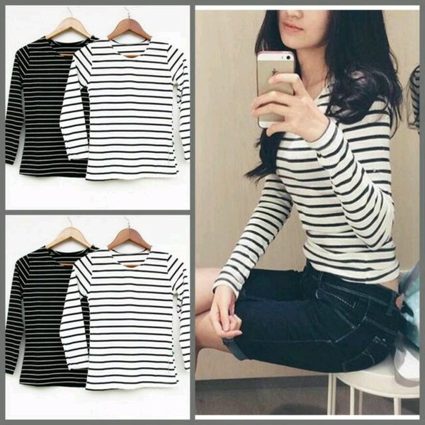 Baju Original Kaos Lengan Panjang Wanita Baju Garis Hitam Putih Atasan Wanita Blouse Wanita Pakaian Model Strip Tshirt Cewek Casual Tunik Wanita Baju Panjang Gamis
