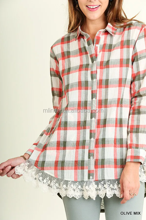 Baju Wanita Lengan Panjang Baju Atasan Wanita Gaya Baru Kotak Kotak Kancing Atas Fesyen Lengan Panjang Renda Trim Wanita Dengan Panel Belakang Rajut Buy Ladies Shirts Designed With Laces Plaid Woven Button Up Long Sleeves Shirt New Stylish Casual