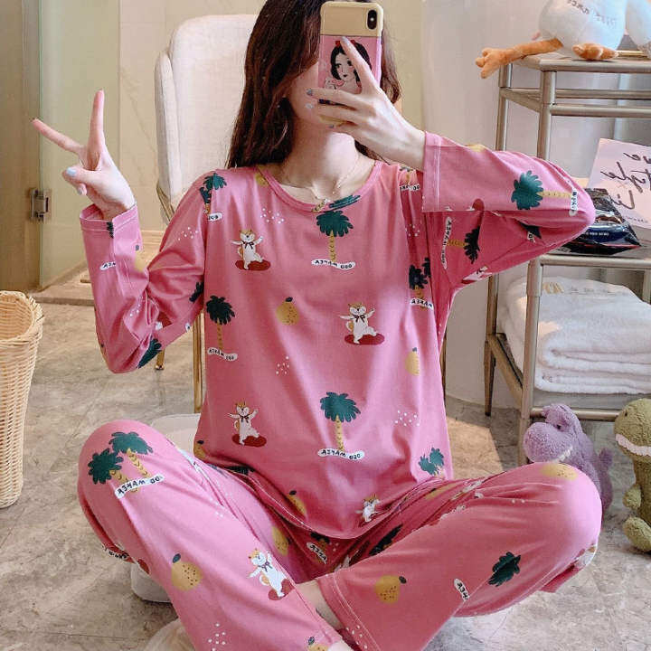 Zeus Kapas Bergaya Kapas Baju Tidur Saiz Besar Wanita Korea Leher Bulat Leher Lengan Panjang Seluar Set Rumah Longgar Pakai Baju Perempuan Lazada