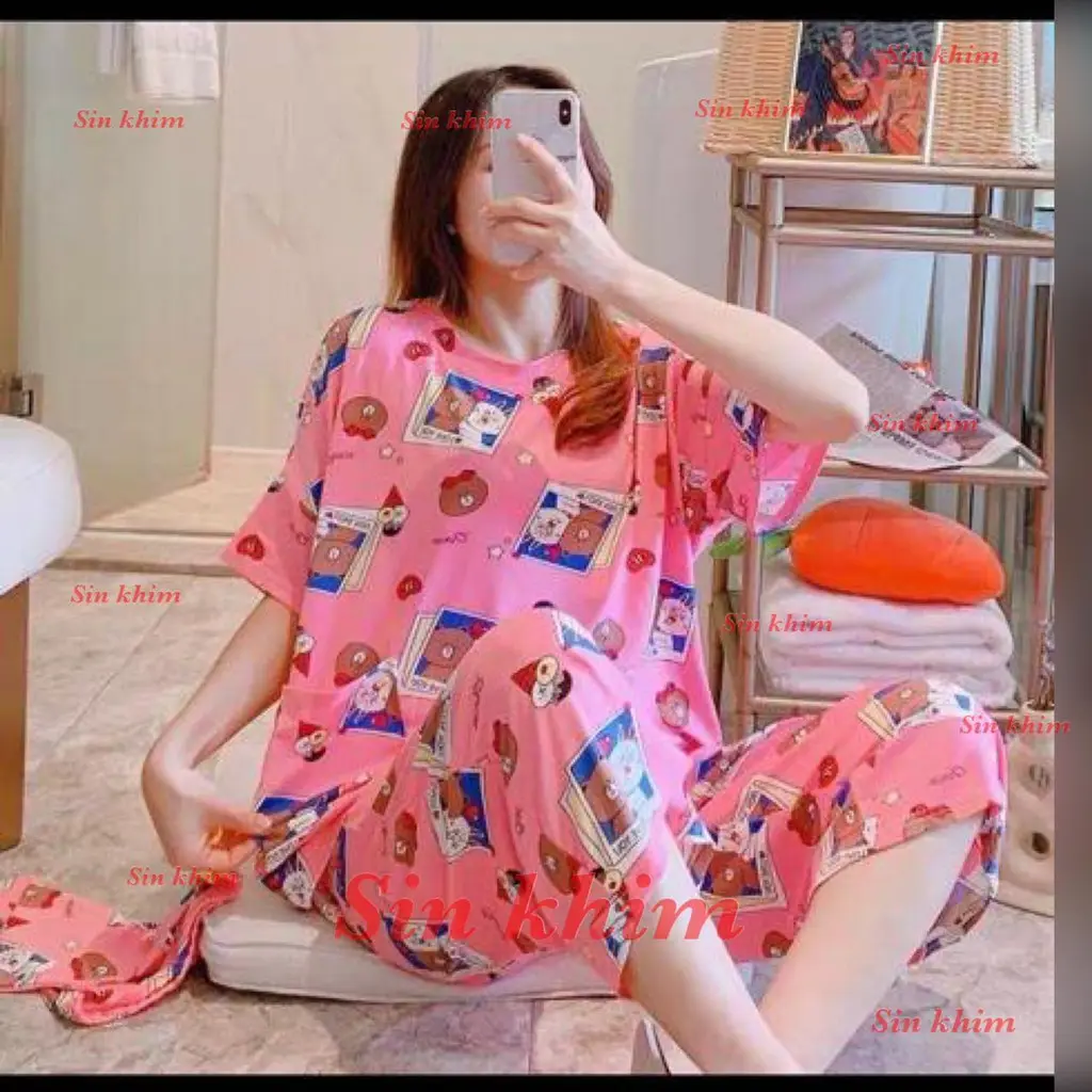 Baju Tidur Setelan Atasan Kaos Kaus Tangan Lengan Pendek Celana Panjang Gantung Katung Cewe Stelan Cewek Santai Katun Pakaian Wanita Dewasa Piyama Pajamas Model 3 4 7 8 Import Impor Murah