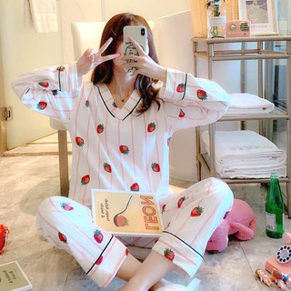 Piyama Baju Tidur Wanita Korea Fashion Strawberry Bergaris Mengenakan Lengan Panjang Dengan Pad Da Shopee Indonesia