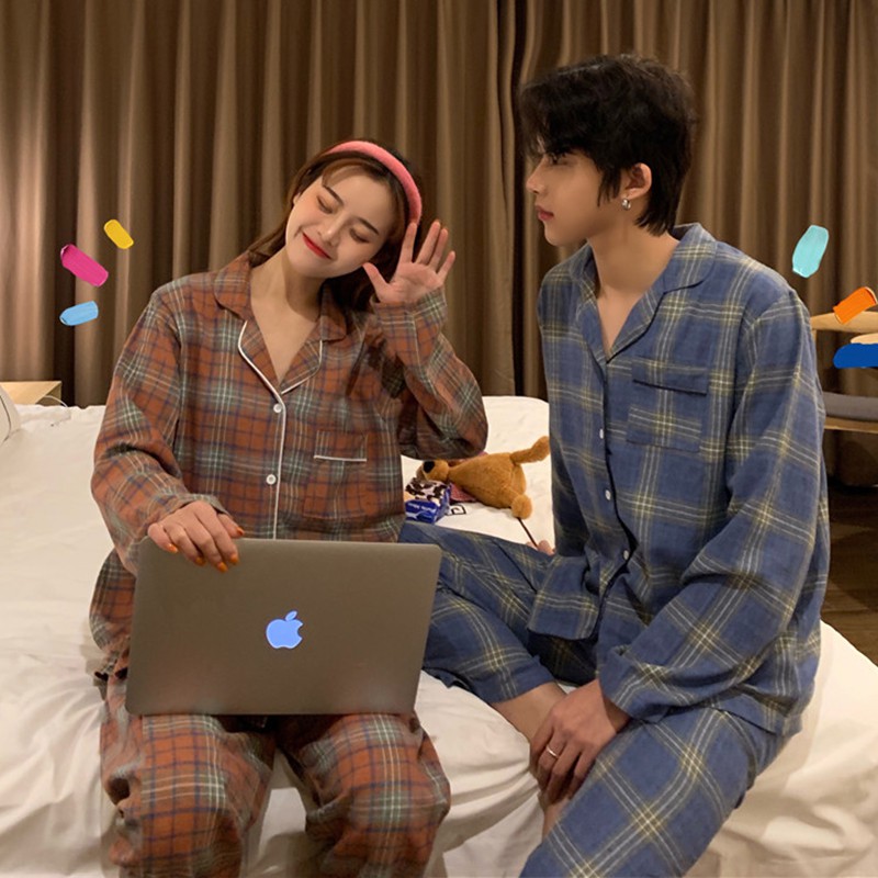 Korea Plaid Loose Long Sleeve Pajamas 2pcs Suit Shopee Singapore