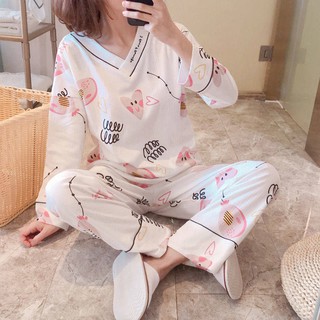 Baju Tidur Wanita Korea Lengan Panjang Yang Manis V Neck Print Piyama Set 2 Piece Shopee Indonesia