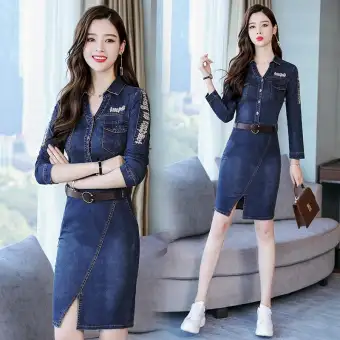 Musim Gugur Modis Koboi Gaun Wanita Pasang Lengan Panjang 2019 Busana Musim Gugur Model Baru Gaya Korea Berpinggang Terlihat Langsing Elegan Rok Denim Lazada Indonesia