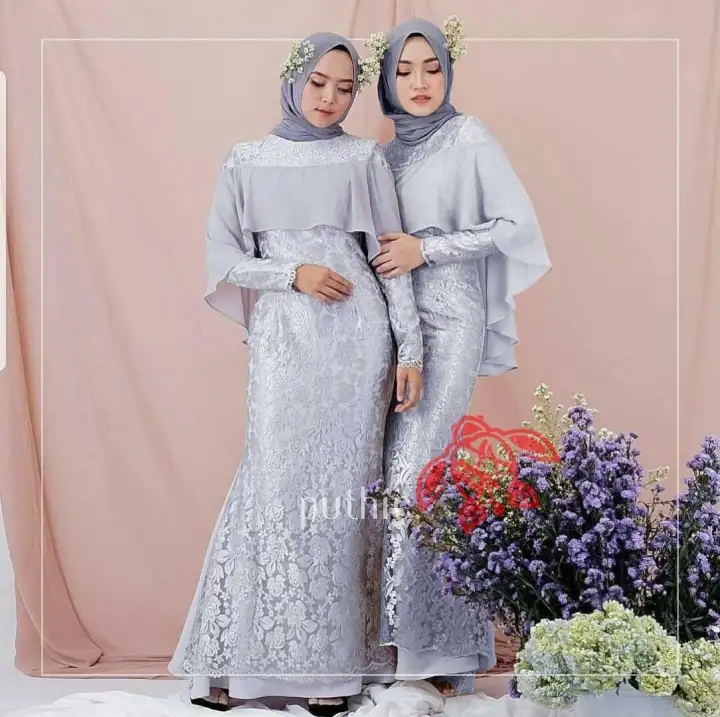 Baju Gamis Pesta Mewah Dan Elegan Rok Duyung Selendang Bahu Brokat Satin Soft Grey Model Pakaian Wanita Casual Hijab Outfit Pakaian Pesta