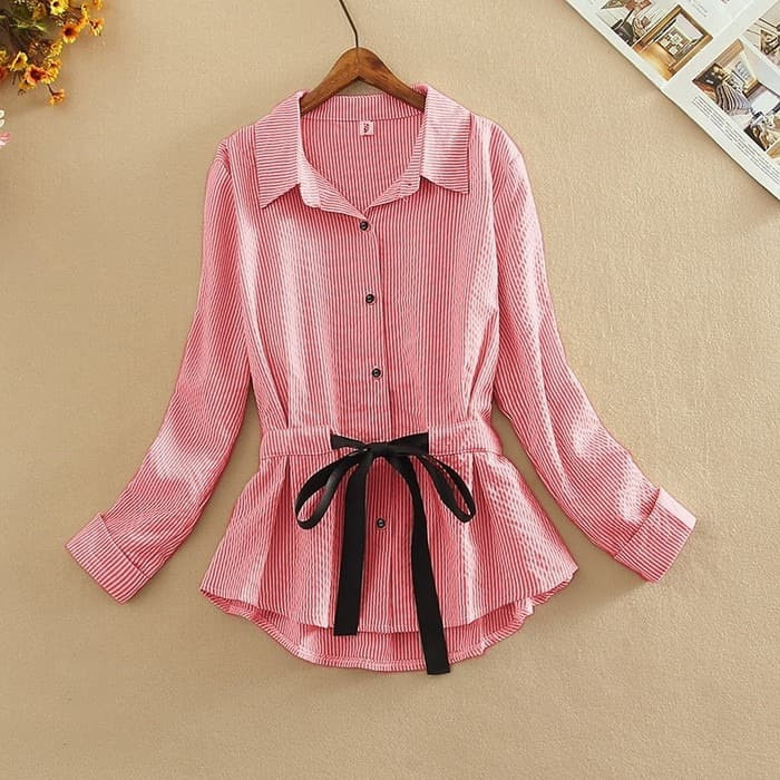 Kemeja Wanita 2020 Korea Lengan Panjang Hem Diikat Baju Baru Slim Tipis Stripe Kemeja Kerah Musim Pa Shopee Indonesia