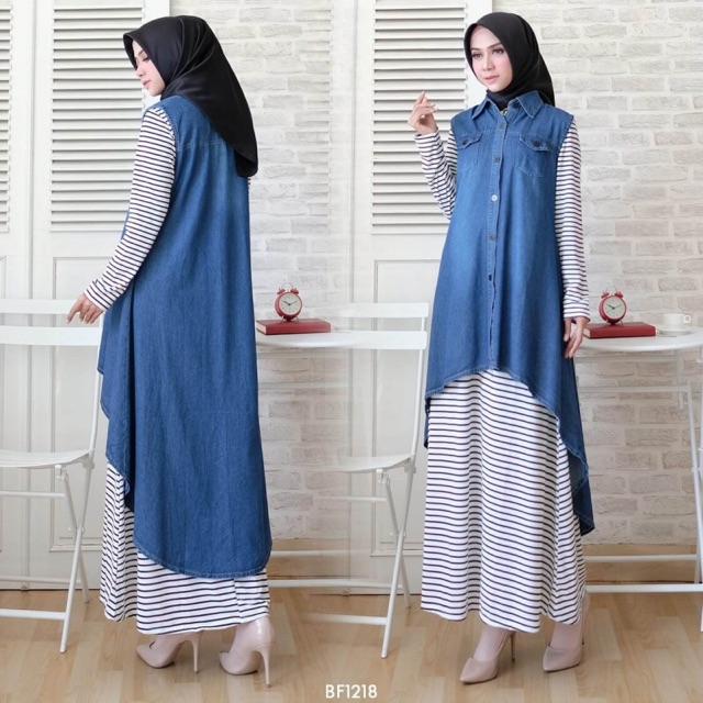 Baju Setelan Gamis Spandek Motif Strip Kombinasi Outer Rompi Jeans Pinguin Set Outer Puffin Bf1218 Shopee Indonesia