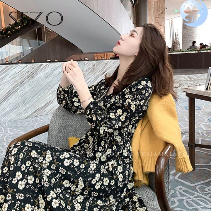 Sezo 2020 Fesyen Wanita Versi Korea Retro Kasual V Leher Tie Panjang Skirt Floral Skirt Lengan Panjang Pakaian Lazada