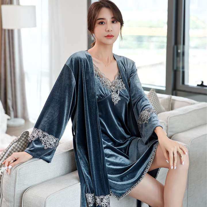 Wanita Slik Butang Nightgown Velvet Pakaian Malam Wanita Kimono Jubah Gaun Sexy 2pcs Set Tidur Trim