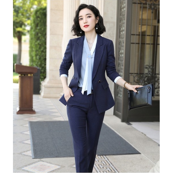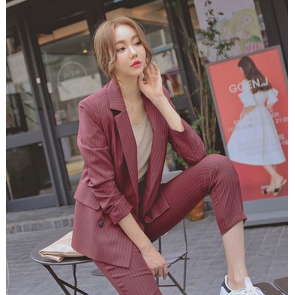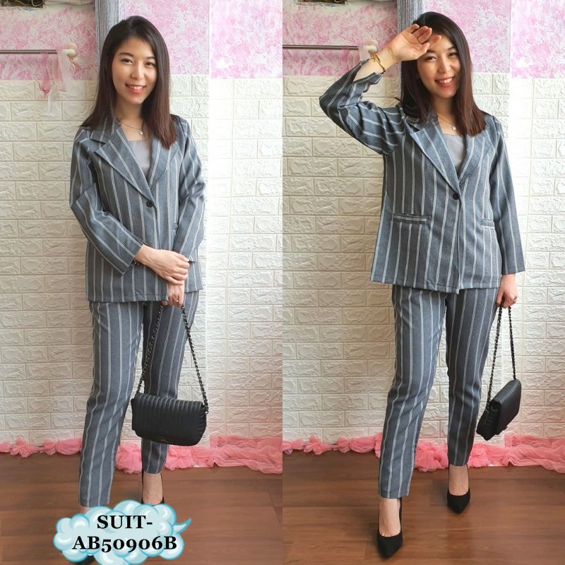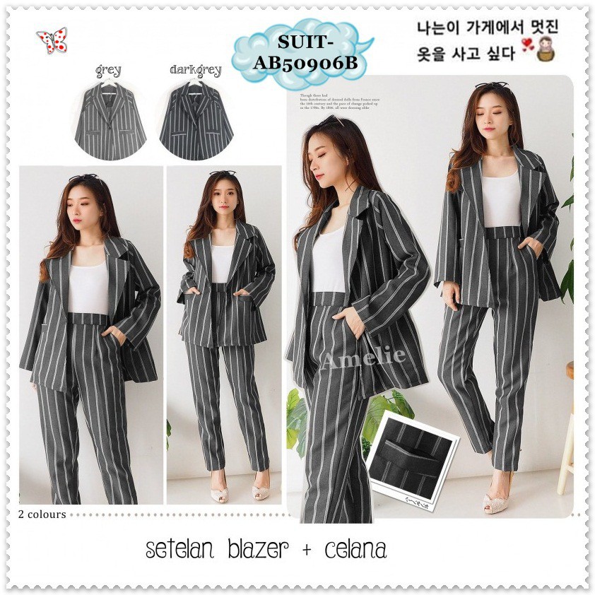 Ol Setelan Blazer Wanita Lengan Panjang Motif Garis Celana Panjang Gaya Korea Untuk Kerja Shopee Indonesia