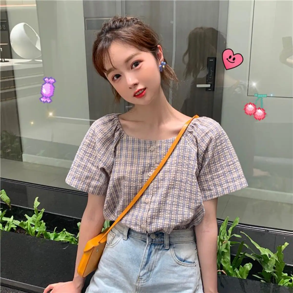 Aurd Kanak Kanak Perempuan Musim Panas Musim Panas Gaya Baru Gaya Korea Persegi Leher Blaus Kotak Kotak Baju Lengan Pendek Wanita Longgar Semua Perlawanan Blaus Lazada